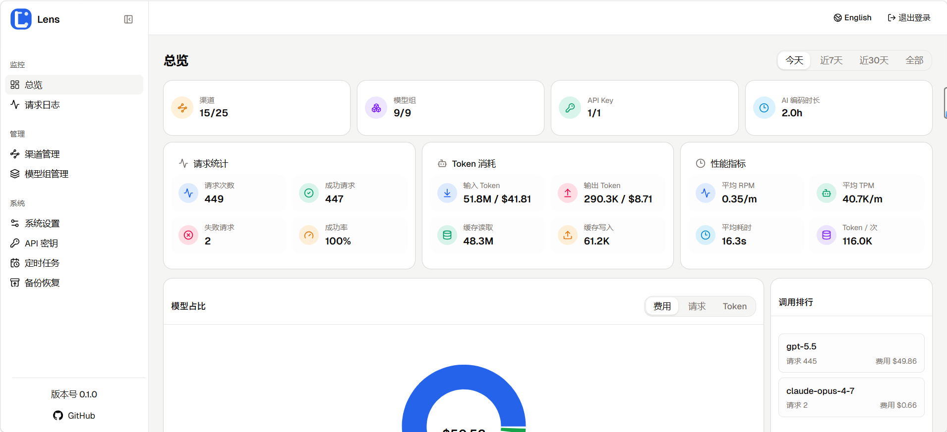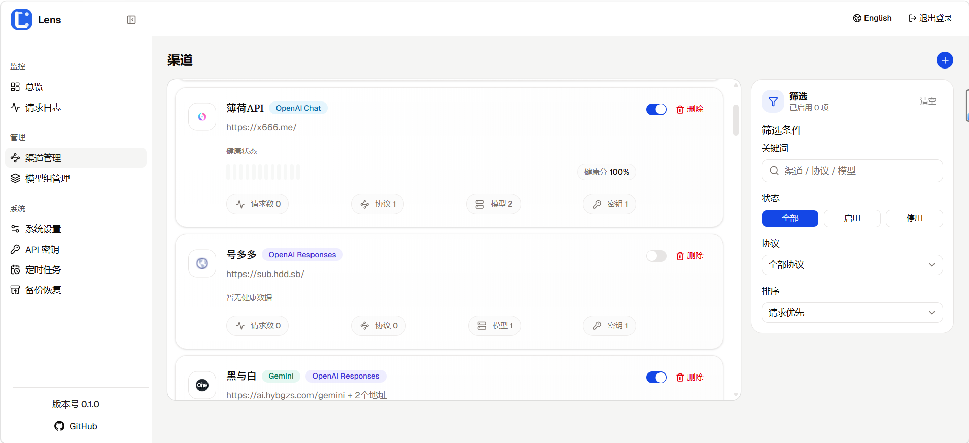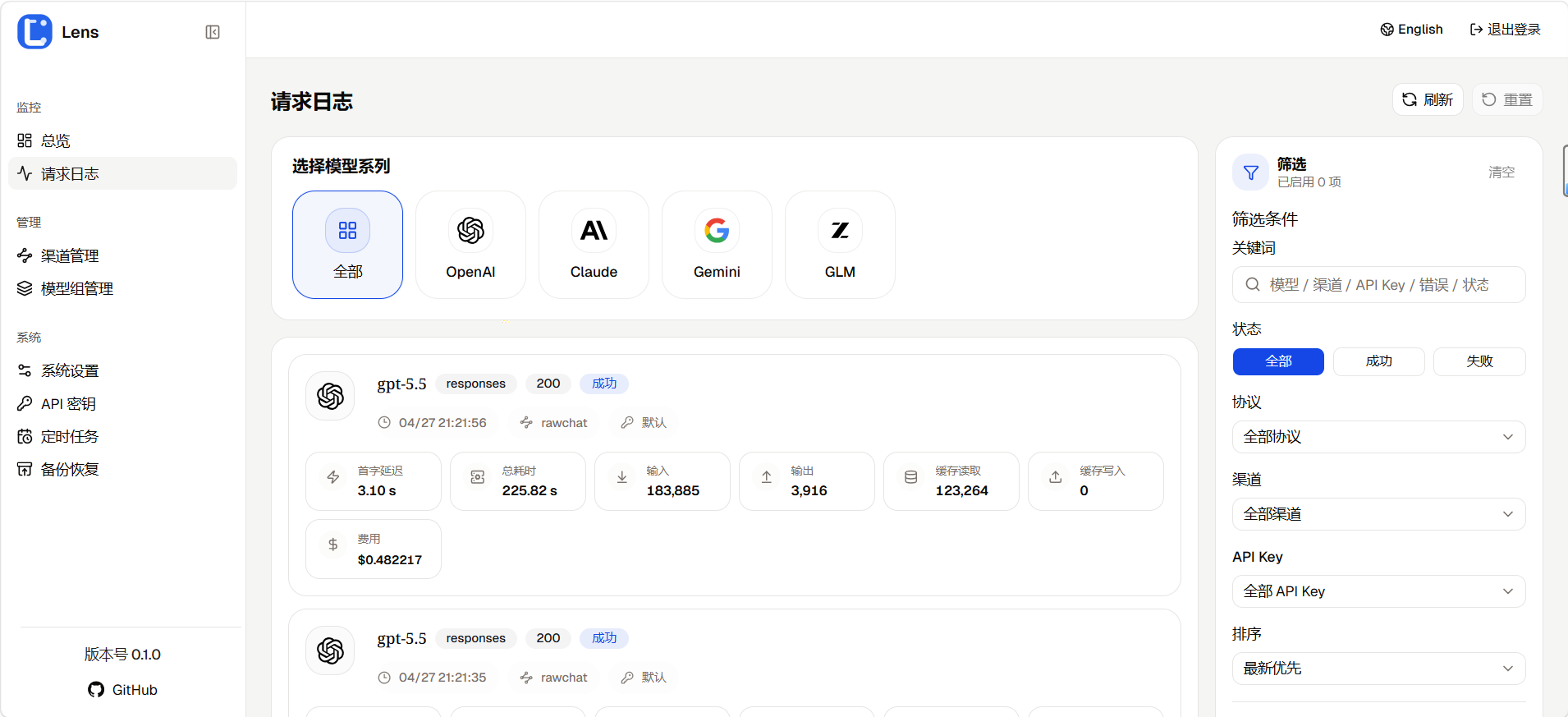 看到太多的go,ts,rust项目了。呜呜,python也想说自己可以,大部分推理框架例如vLLM、SGLang都是python写的,写的聚合项目速度再怎么快,上游也不给力啊,何况项目定位的是个人使用,简简单单的高并发python也是可以的,所以你可以把lens看成python版的个人api聚合网关~